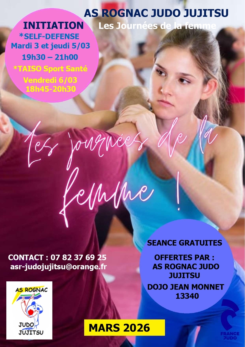 Le mardi 3, et le jeudi 5 mars de 19h30 à 21h00 initiation self défense au dojo Jean Monnet.