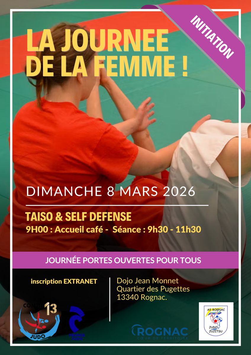 Notre association AS Rognac Judo Jujitsu organise une journée de stages en partenariat avec le Comité 13 de judo au dojo et à la salle polyvalente Jean Monnet, le dimanche 8 mars 2026 dans le cadre de la journée de la Femme.